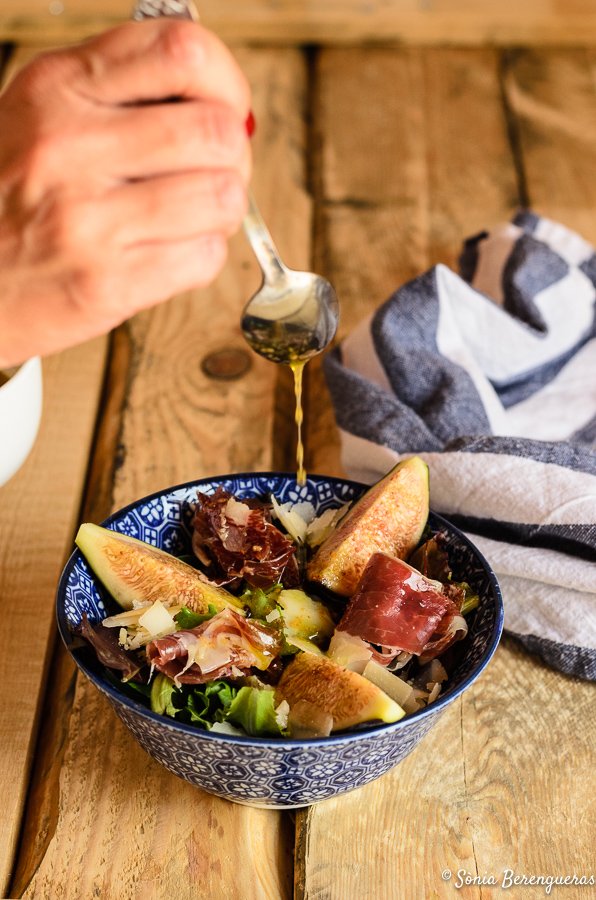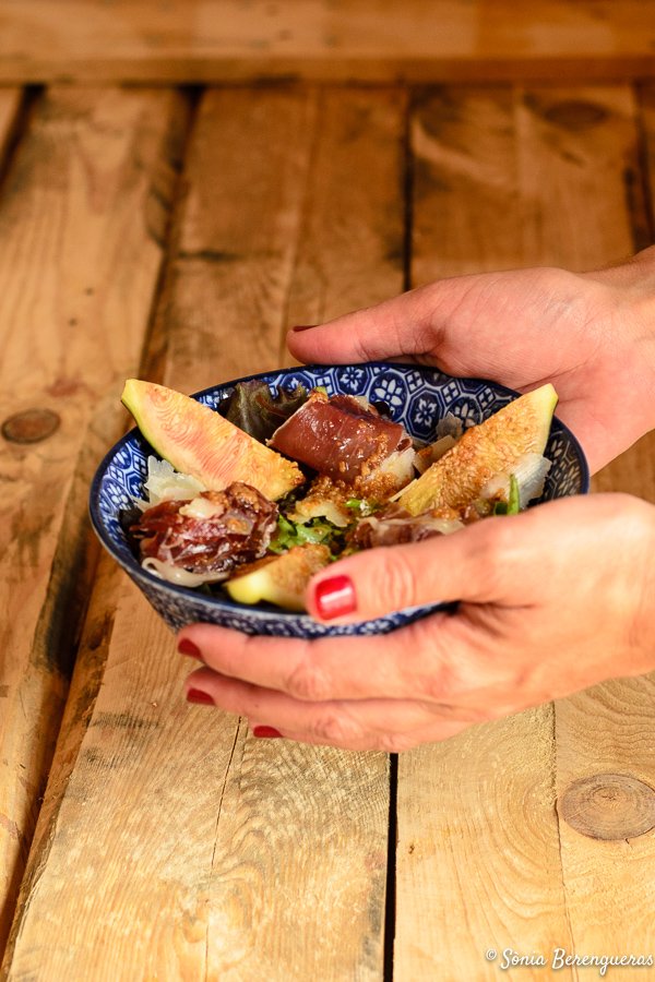 Amanida amb figa flor, pernil de gla i vinagreta de carquinyolis
