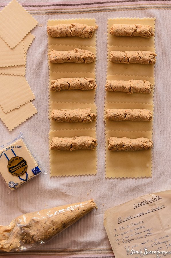 Tot i que les quantitats que poso son per un paquet de canelons, al ser molt entretinguts de fer, jo he afegit més tall i n’he fet uns quants més que he congel.lat en safates de 6 i de 12, sense la beixamel.