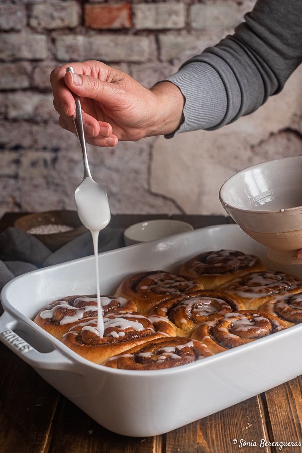 - Si voleu per decorar els cinnamons podeu preparar un glassejat barrejant el sucre llustre amb l’aigua que haureu de posar un cop s’hagin refredat.