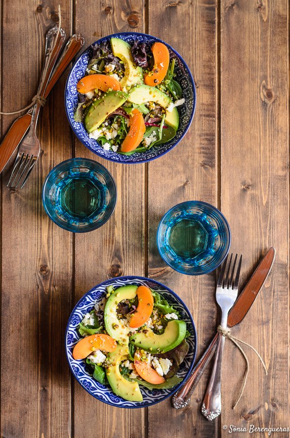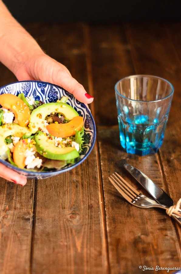 - Para emplatar la ensalada, pondremos unas hojas de lechuga en la base del plato, ek queso de cabra desmenuzado, unas láminas de aguacate, unos gajos de albaricoque y unos granitos de pistacho.