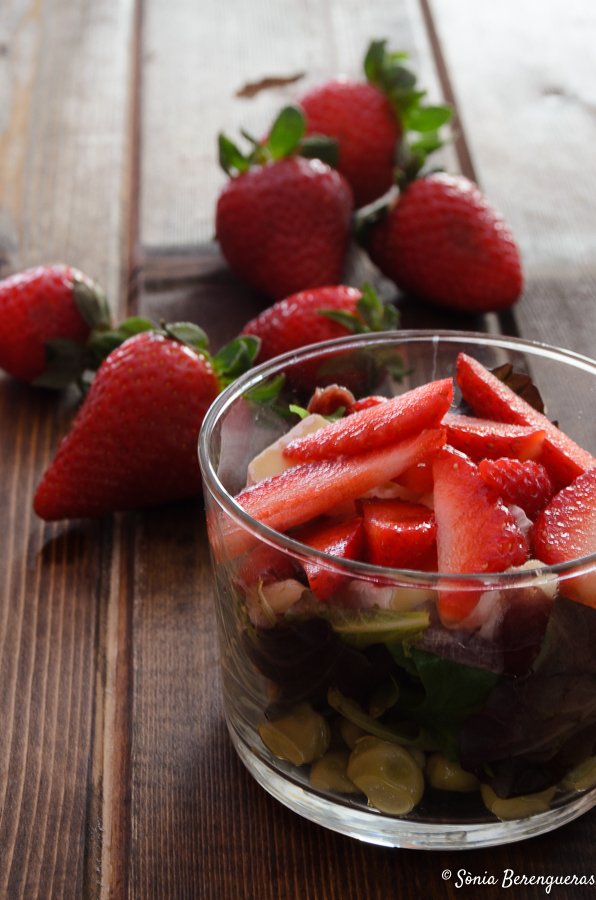 - Para servir la ensalada en un vaso, haremos lo siguiente: empezaremos colocando una capa de habitas, encima colocaremos unas hojas de mezclum, después unas virutas de jamón ibérico, unos daditos de queso brie o el que más os guste y finalmente unas fresas cortadas a bastoncitos.