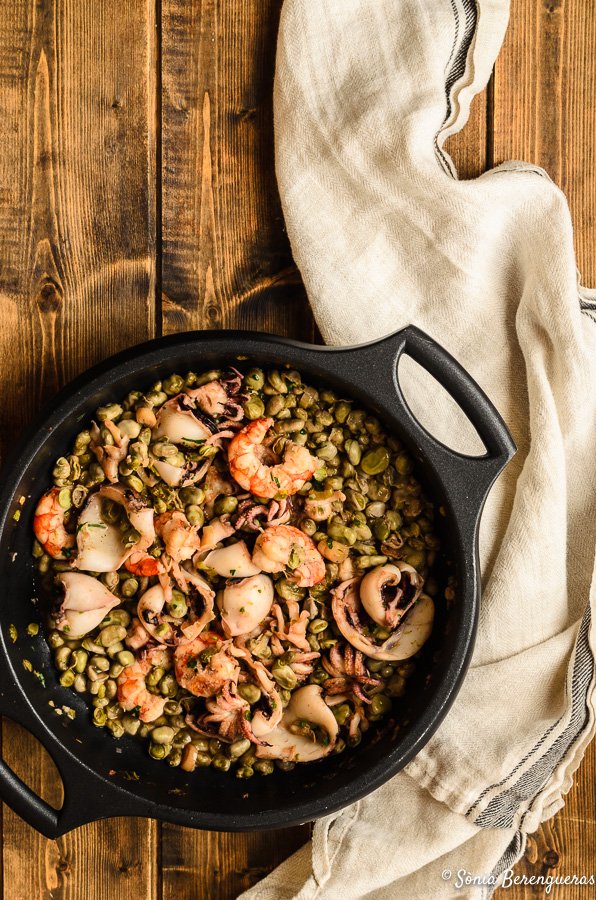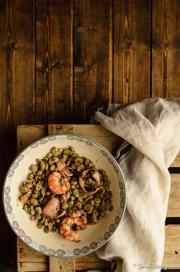 Ja sabem que la recepta més coneguda amb faves son les faves ofegades o faves a la catalana, un plat que sovint fem a casa, quan n’és temporada. Però com que m’agrada variar una mica, les primeres que hem collit les he fet amb sipiones i gambes. A veure què us sembla!